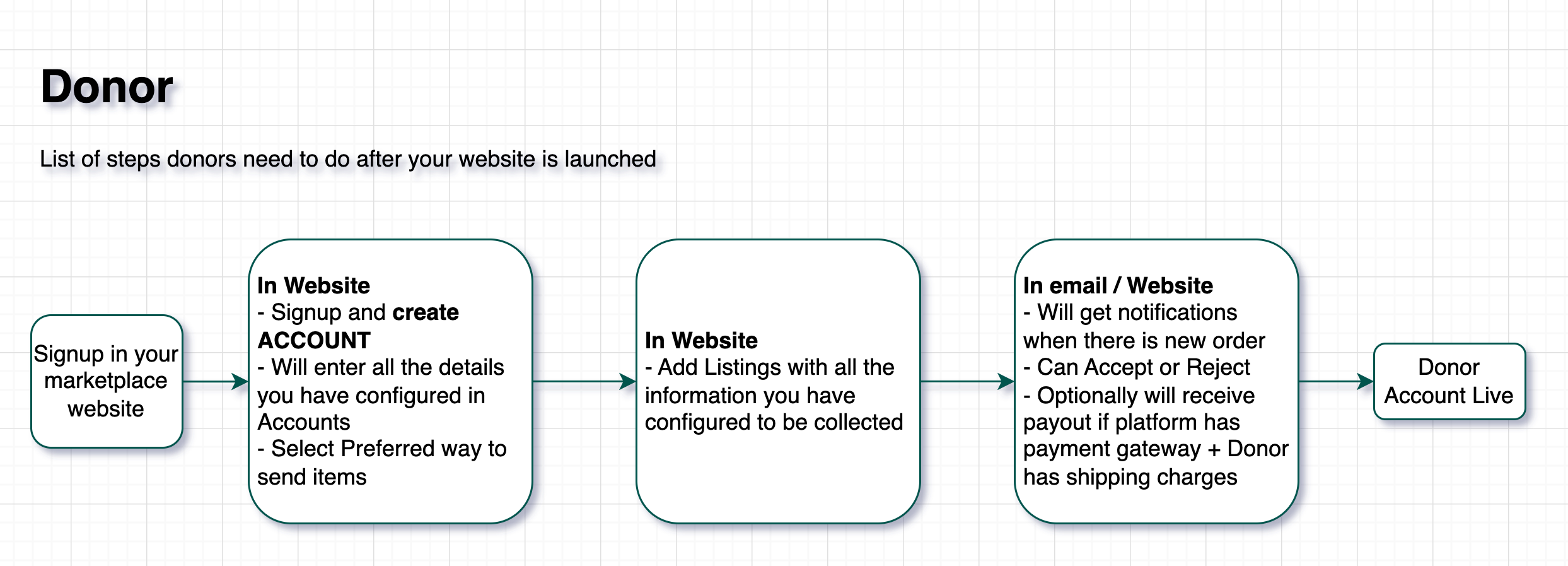 - Open a donor account: they can select whether they want shipment preferences like pickup collection, drop off. Or you can even configure collection points where people can drop off / pickup.