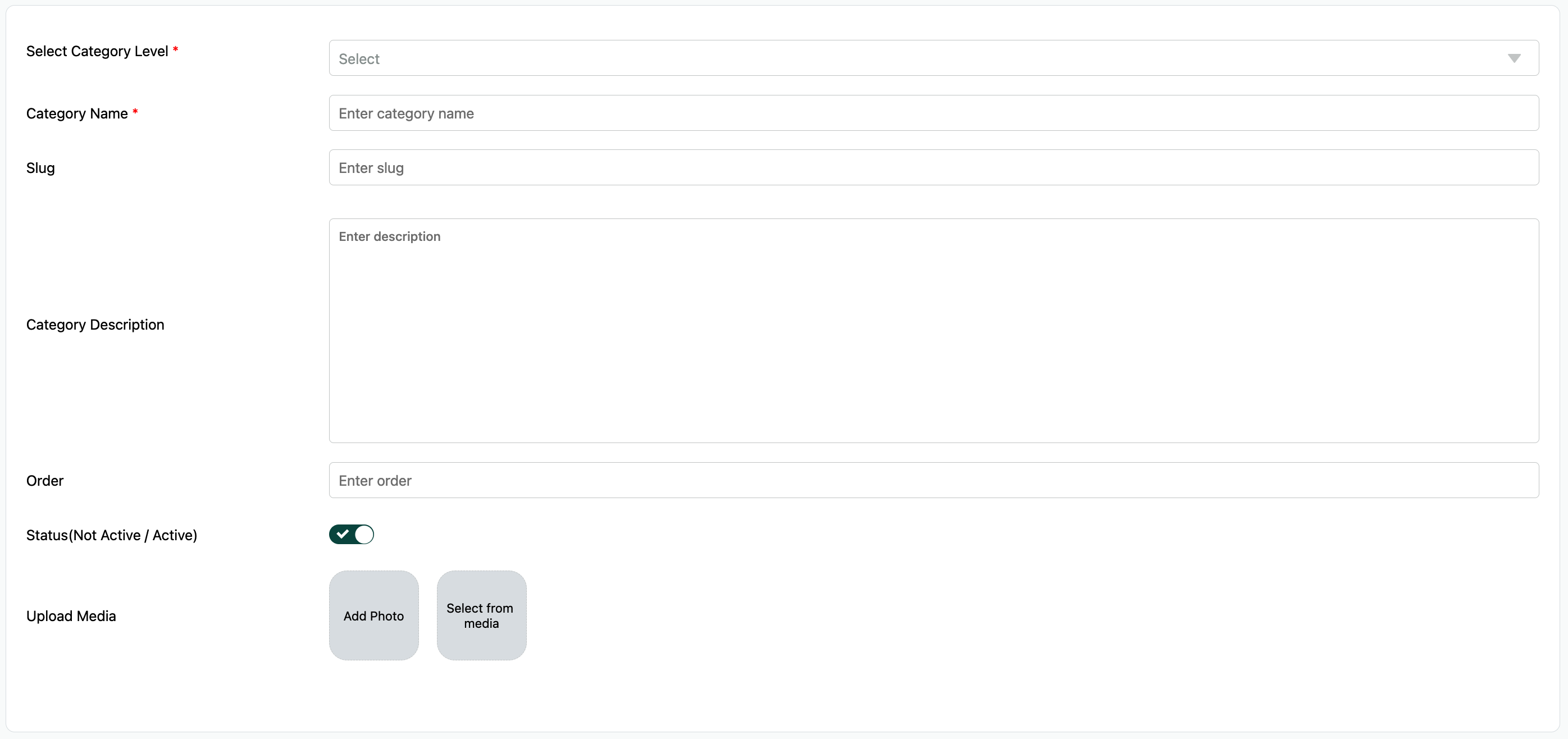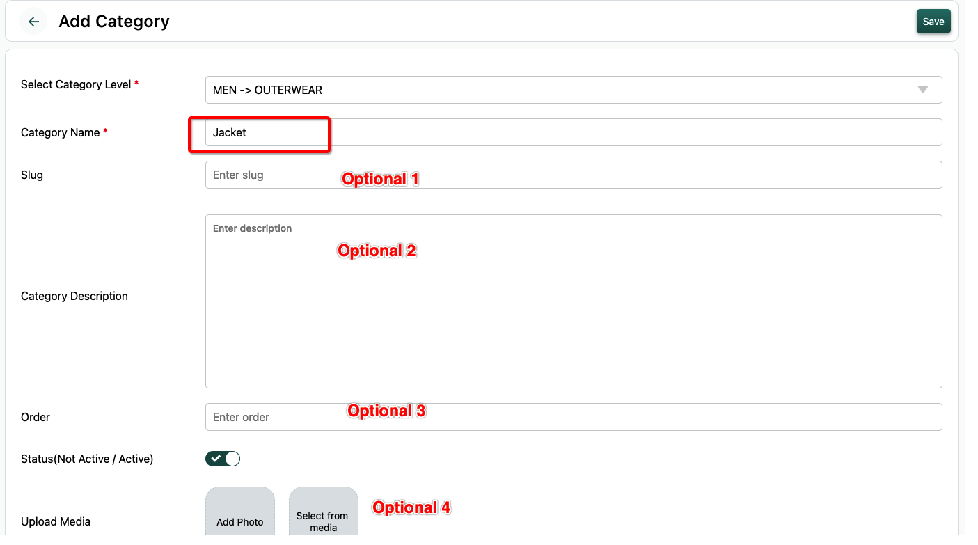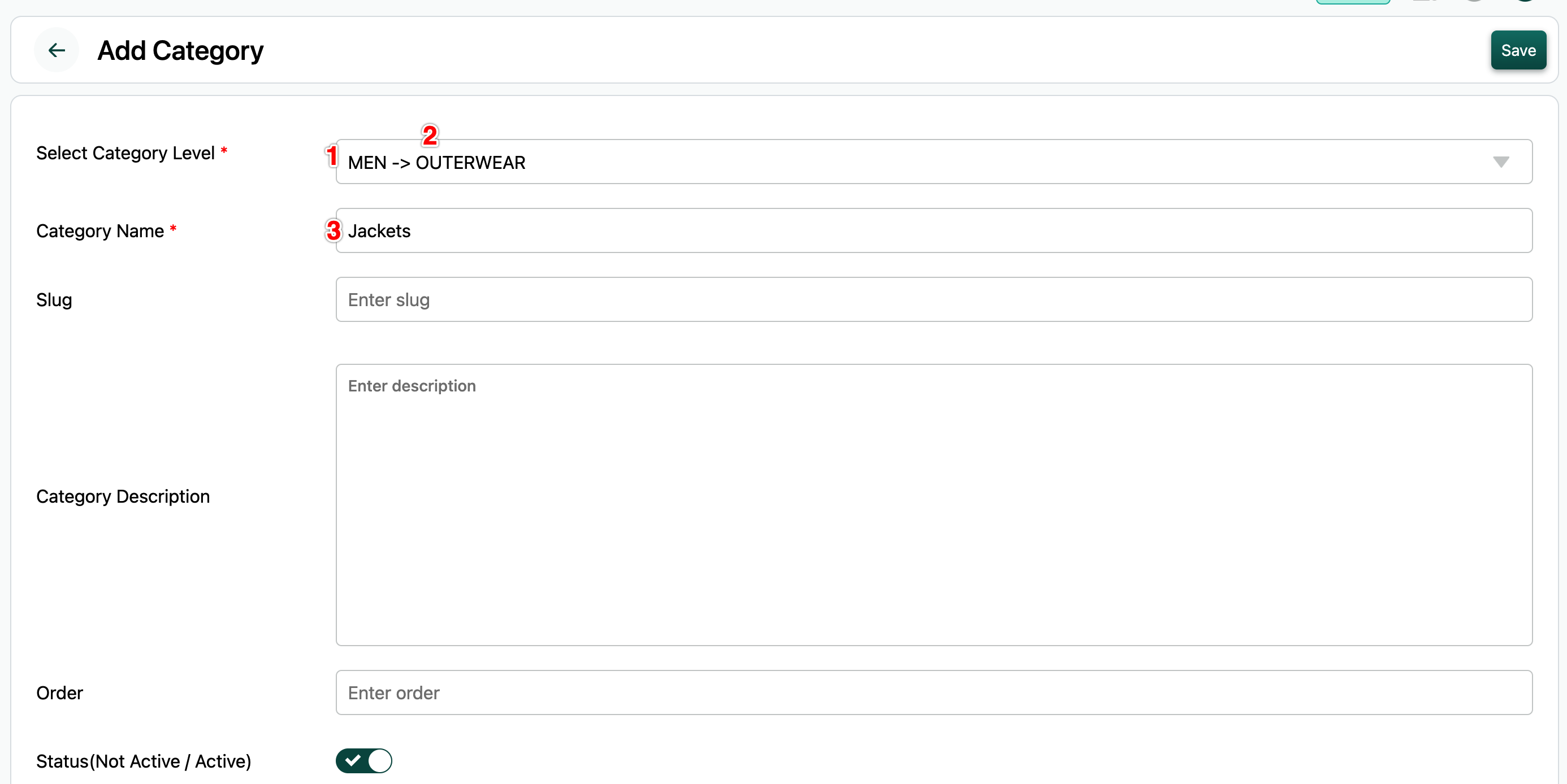 - ORDER number: If you are planning to re-arrange the categories in the order (From Category list page as well, you can use DRAG functionality to arrange them)
