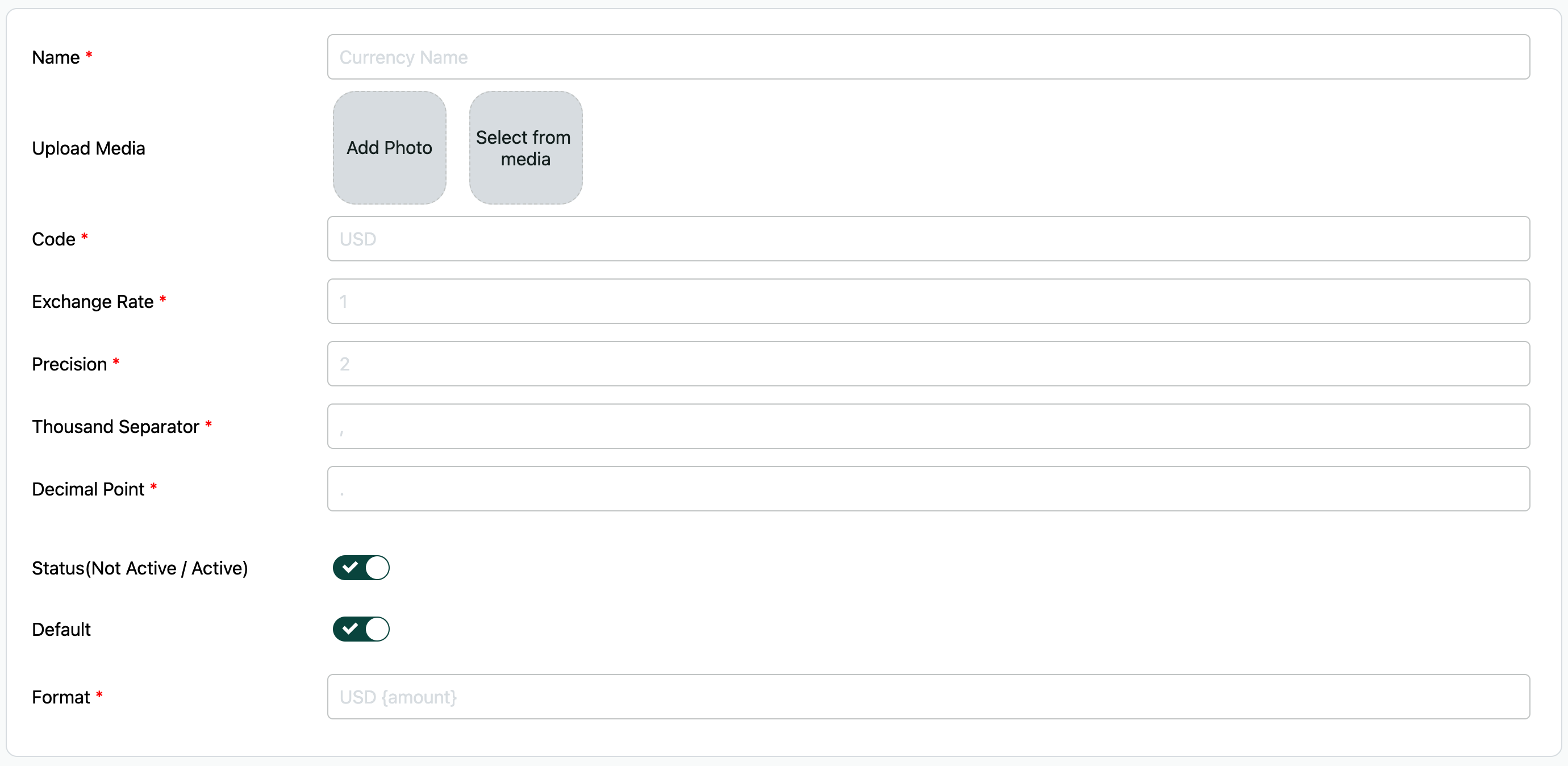 - Exchange Rate: If your base currency is USD and you are adding MYR as currency. It should be the conversion from USD to MYR.