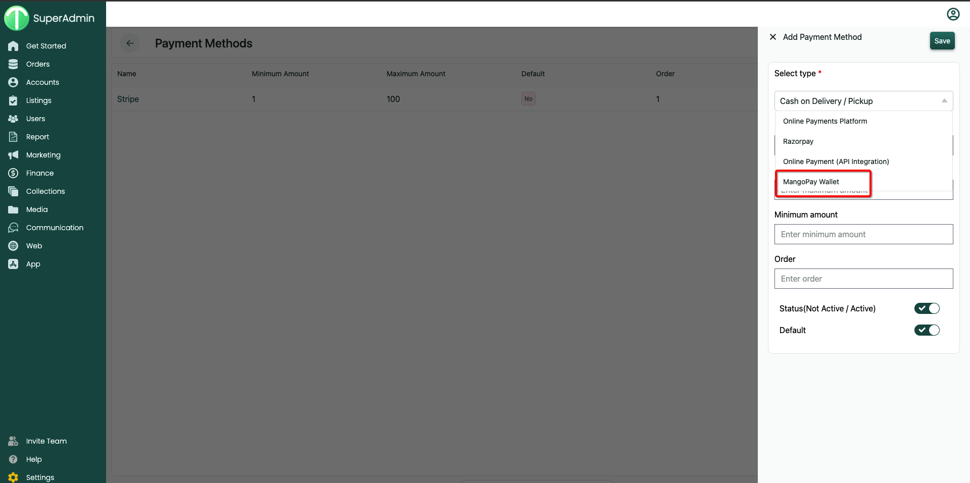 - Go to SuperAdmin > Settings > Payment (https://superadmin.tradly.app/settings)