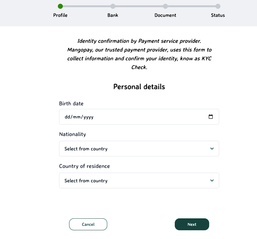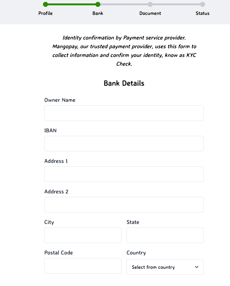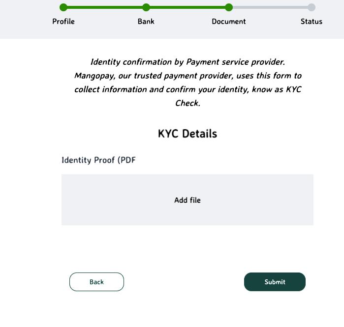 withdrawbutton, it will ask them to have their KYC verified, bank details, etc. Unlike Stripe, mangopay will not ask account(lender, seller, campaign owner) to visit mangopay website. Every information is collected in tradly hosted website and will be sent to mangopay via API. Once mangopay verify the informations (for compliance purpose), the account would get approval.