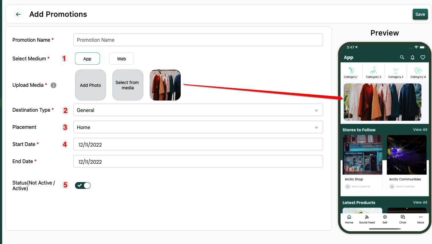 - Placement type: Choose where you want the promotion to be placed (e.g. on the homepage, in a particular section)