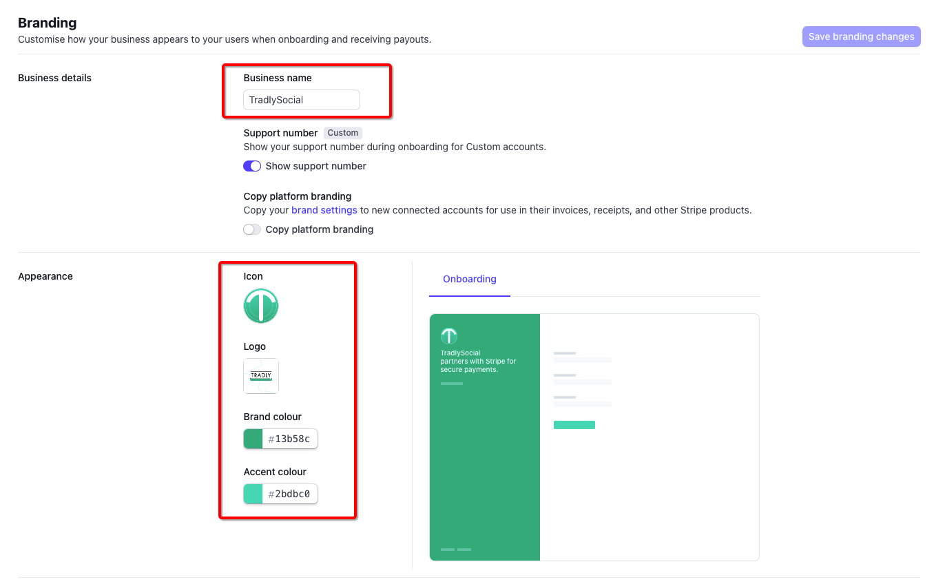 After you sign up or if you have already a stripe account, fill the branding details as below.