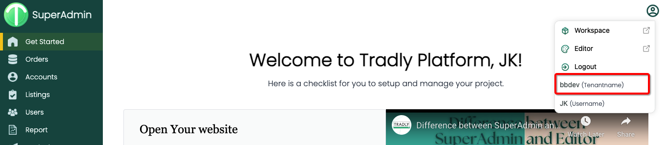 Your tradly name is the same what you have added as app name when signing up. Or else you can find the tenant name here in SuperAdmin.